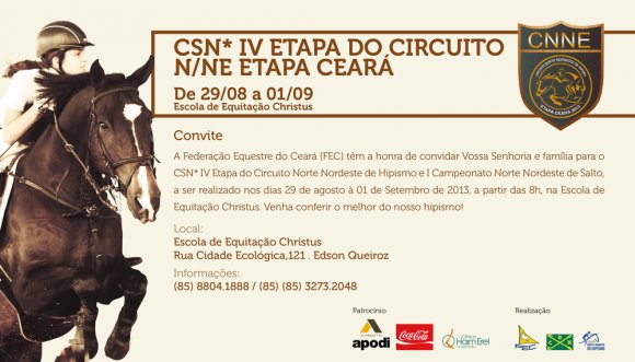 A Federação Equestre do Ceará (FEC) têm a honra de convidar Vossa Senhoria e família para o CSN* IV Etapa do Circuito Norte Nordeste de Hipismo e I Campeonato Norte Nordeste de Salto, a ser realizado nos dias 29 de agosto à 01 de Setembro de 2013, a partir das 8h, na Escola de Equitação Christus. Venha conferir o melhor do nosso hipismo!